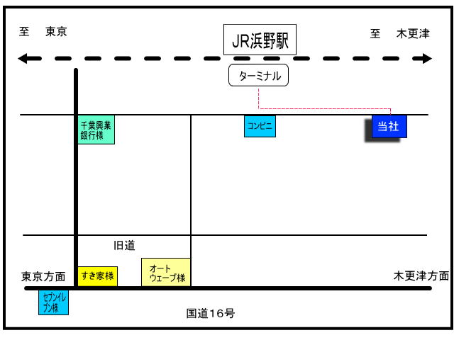 ・電車で、お越しの方、JR浜野駅(西口)下車 木更津方面へ徒歩5分 千葉県千葉市中央区村田町710−3 株式会社 京葉ビル整備 千葉営業所 TEL 043−268−3710 FAX 043−268−3713 E-mail mente@kanri.co.jp トップページに戻る